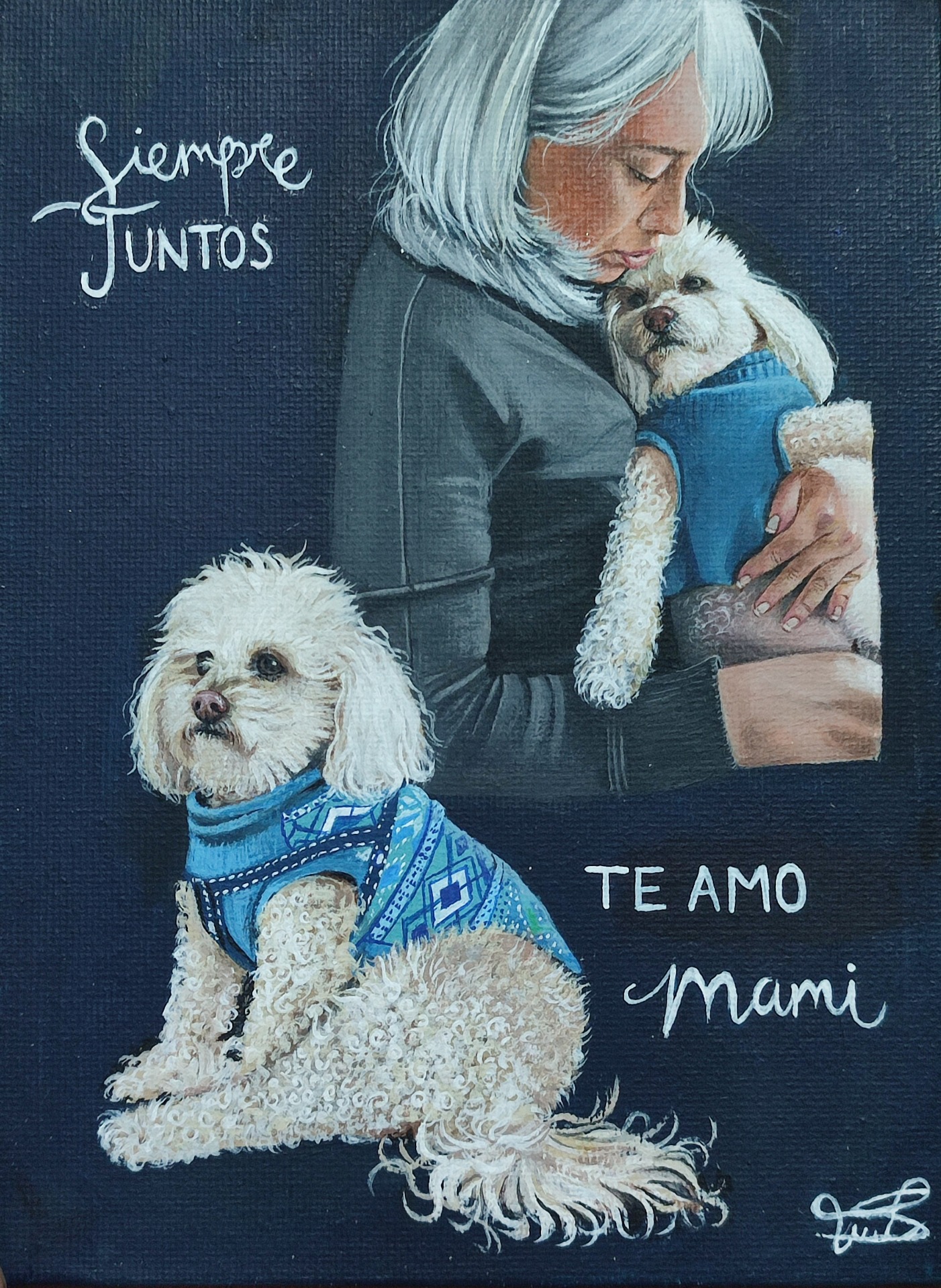 Retrato de persona y mascota tipo collage con adición de detalles por gusto del cliente.